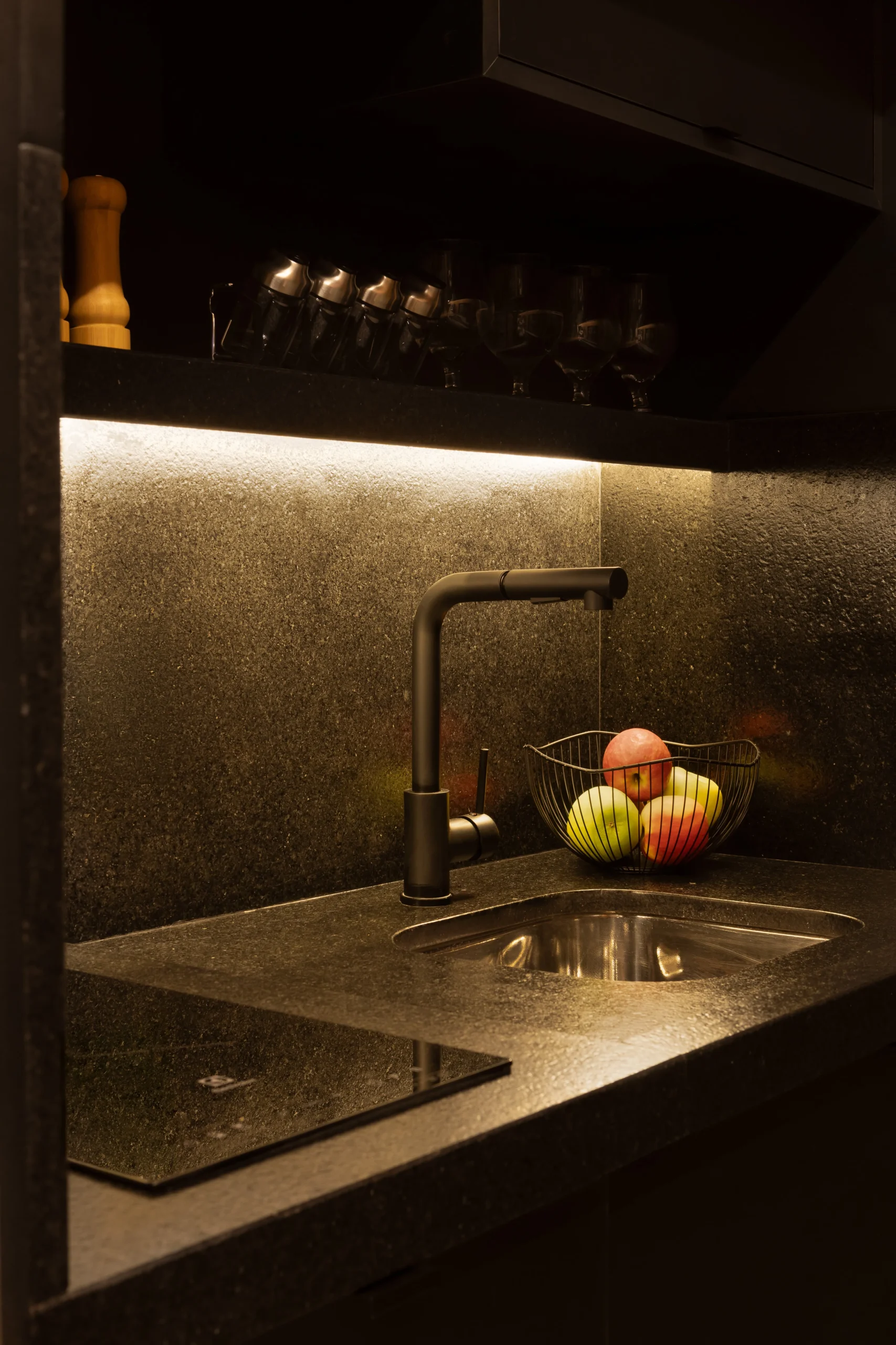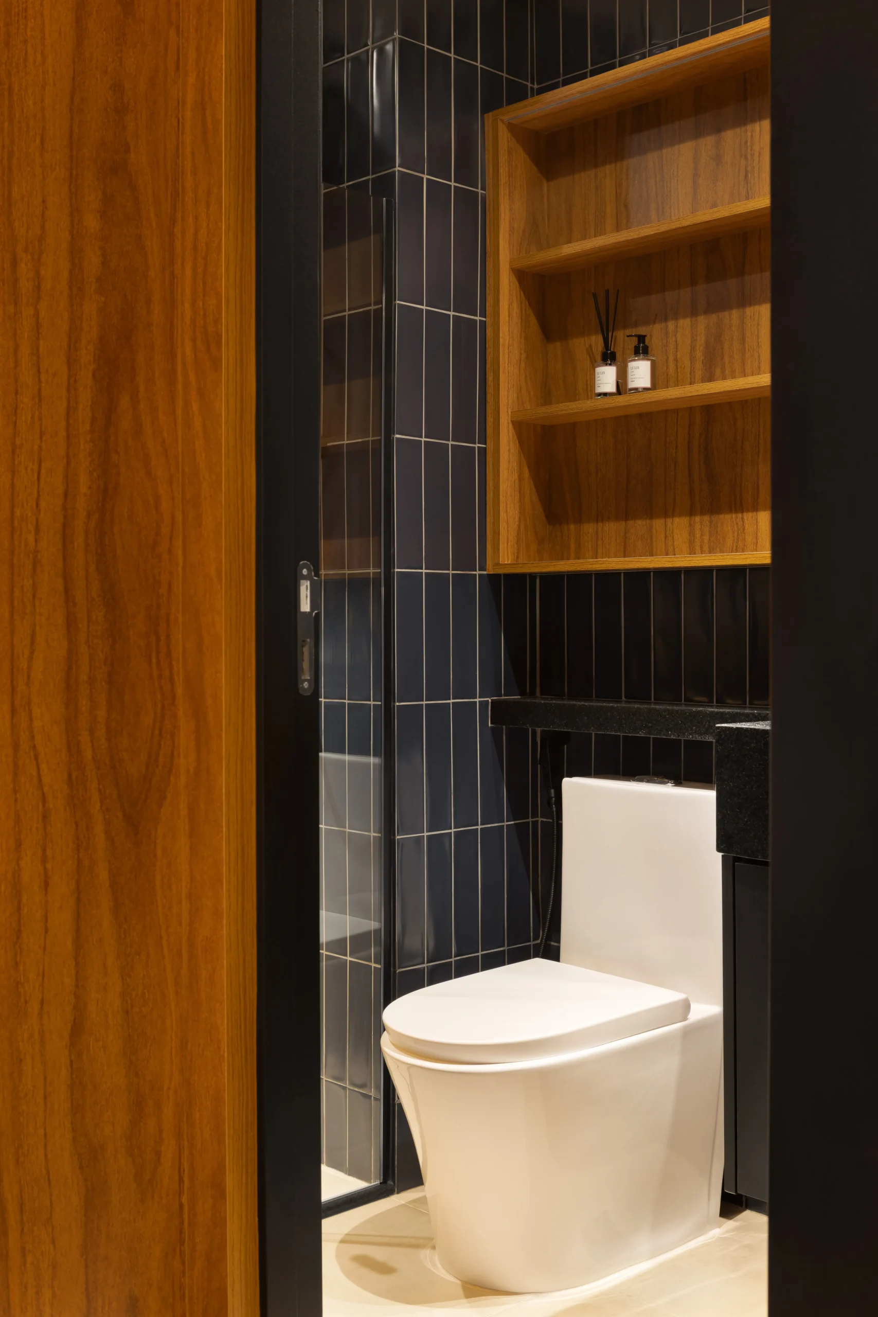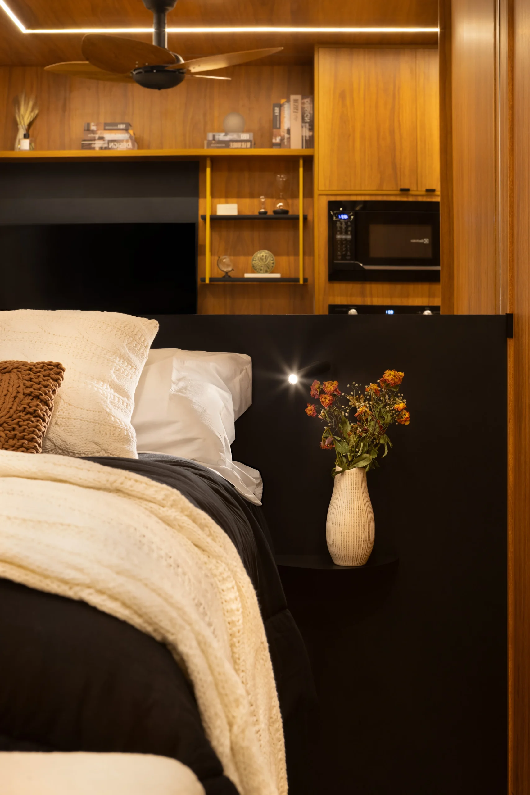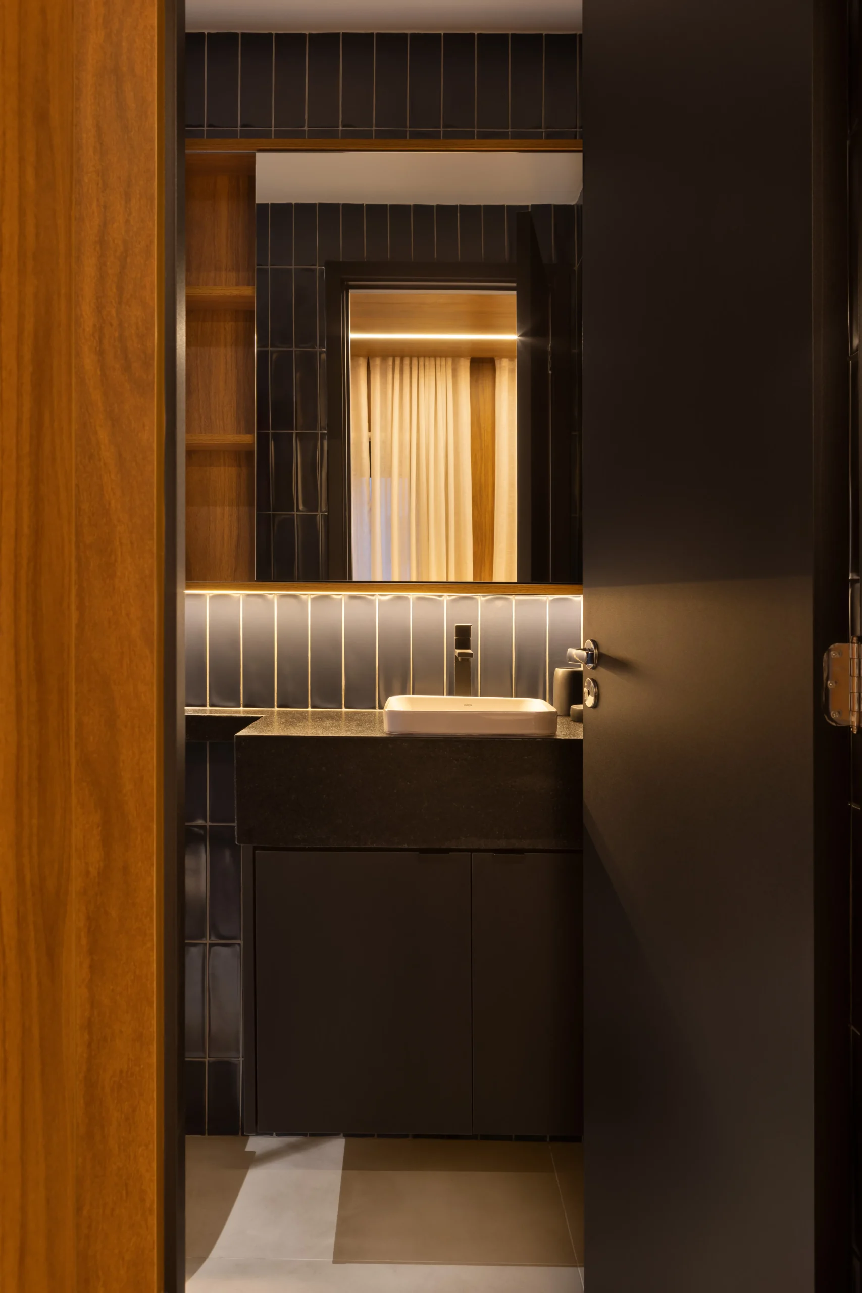 A cozinha, totalmente equipada, posiciona o imóvel acima da média regional, impactando positivamente indicadores como taxa de ocupação, tempo de permanência e rentabilidade, especialmente em operações vinculadas à gestão de Airbnb. O banheiro adota uma linguagem sofisticada e consistente, com revestimentos Portobello em todas as paredes, metais pretos e bancada em Granito Preto São Gabriel Escovado, garantindo coerência estética com o restante do studio e resistência ao uso contínuo. A iluminação foi projetada para oferecer conforto visual e funcionalidade, utilizando luz indireta e fitas de LED de forma controlada e precisa.