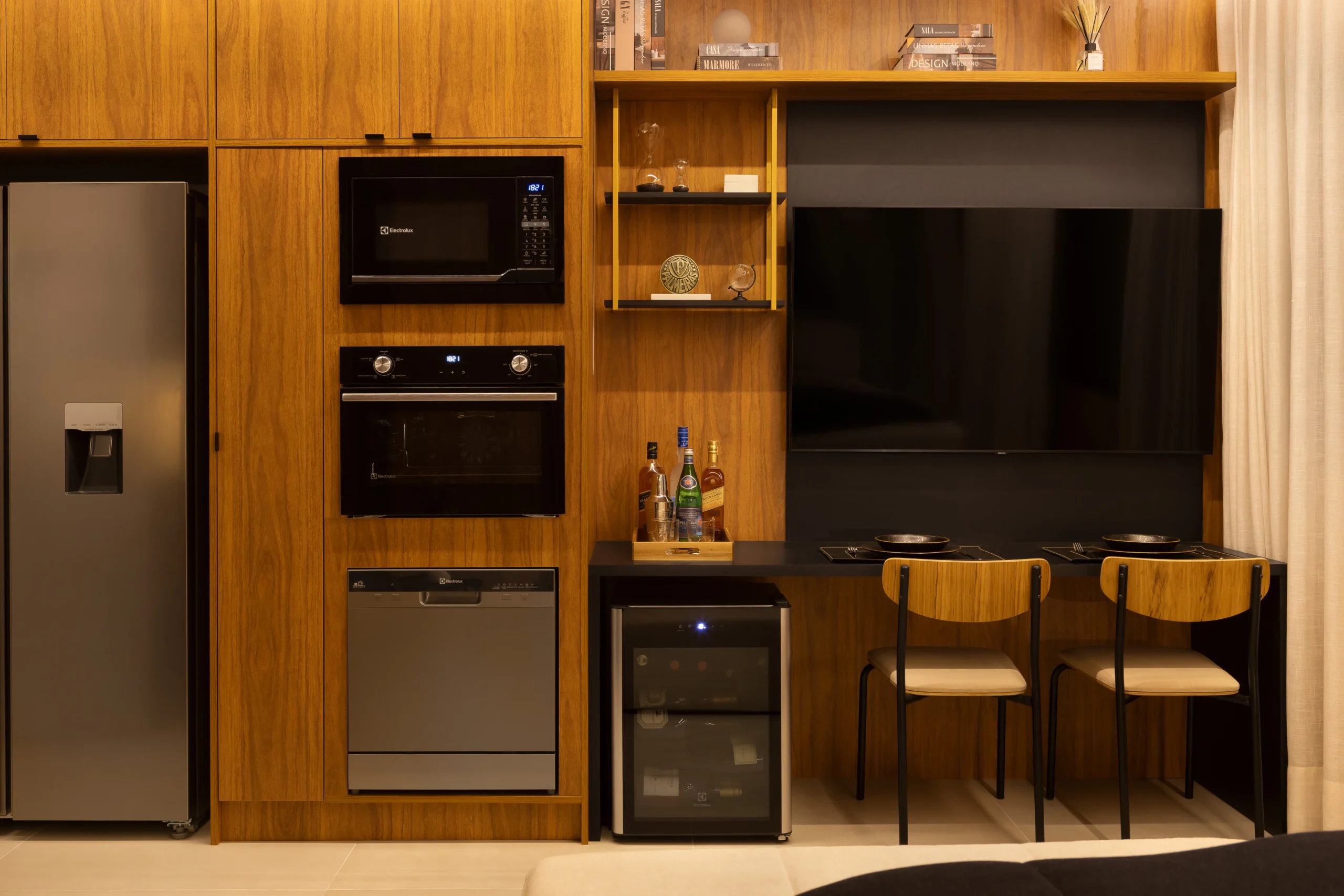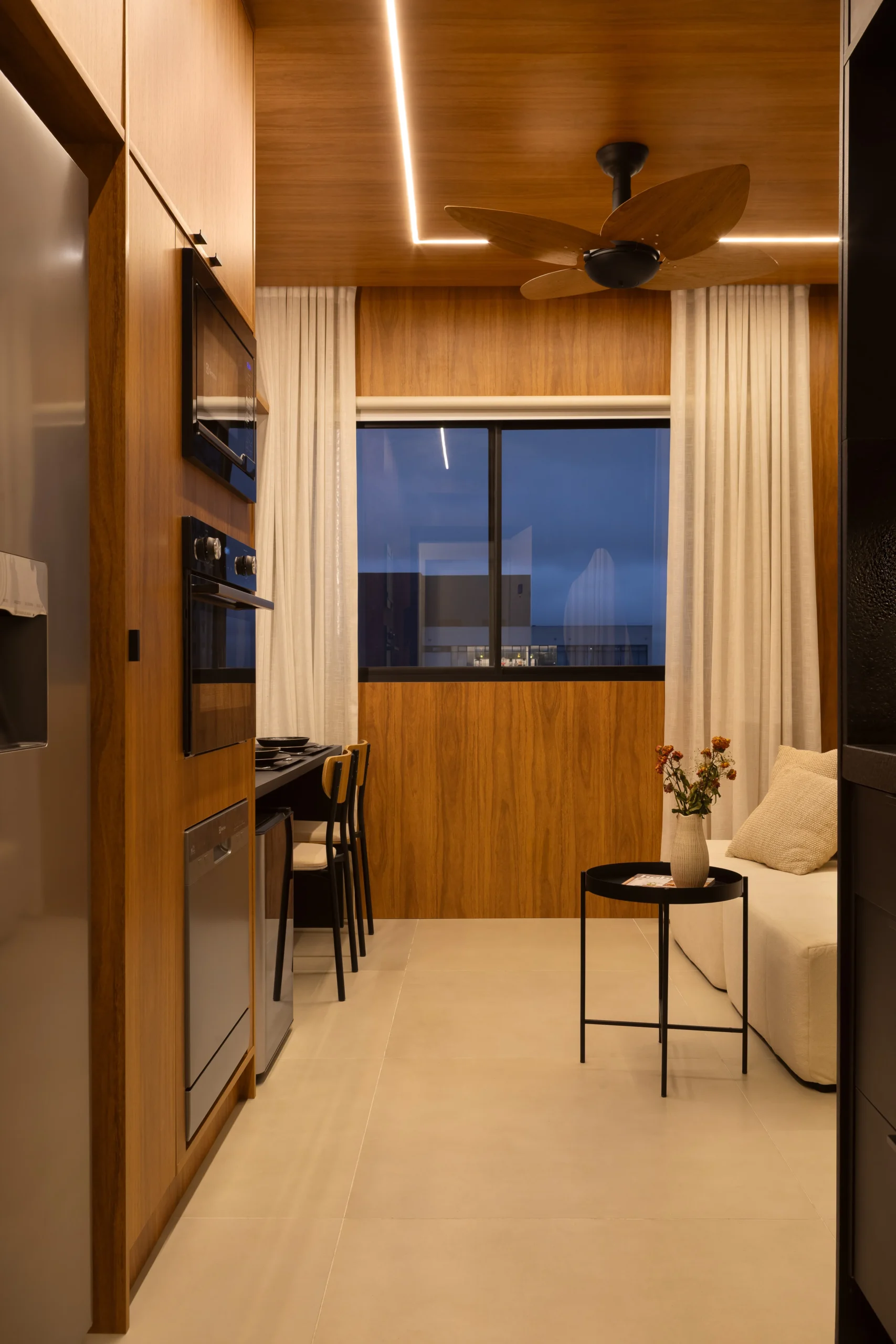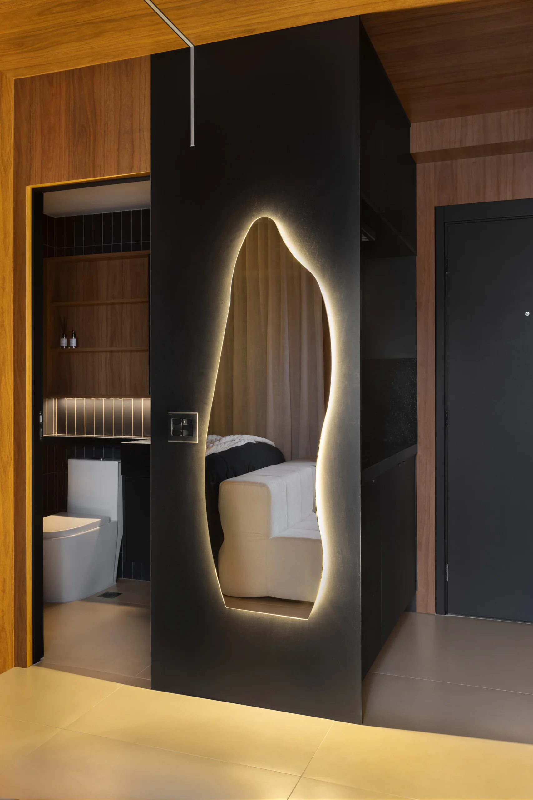 Localizado em frente ao Allianz Parque, um dos principais polos de eventos e entretenimento de São Paulo, este projeto foi desenvolvido com foco em desempenho imobiliário, considerando o perfil de locação de curta e média duração da região. O apartamento de 26m², originalmente configurado com um dormitório, passou por uma reestruturação completa para adequação ao modelo de studio de alto padrão. A remoção da parede do quarto permitiu a criação de um ambiente integrado, com melhor aproveitamento espacial, maior continuidade visual e aumento da percepção de conforto; fatores diretamente relacionados à valorização do ativo. Todas as paredes do studio foram revestidas em marcenaria planejada, organizando e estruturando todo o espaço, garantindo unidade visual, eficiência funcional e facilidade de manutenção. O projeto contempla soluções completas de armazenamento, área de estar confortável, camas de alto padrão e televisão de 58”, compondo um layout equilibrado entre uso, estética sofisticada e durabilidade.