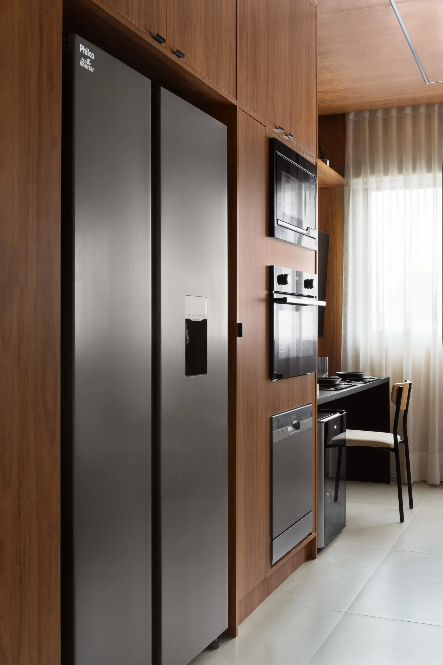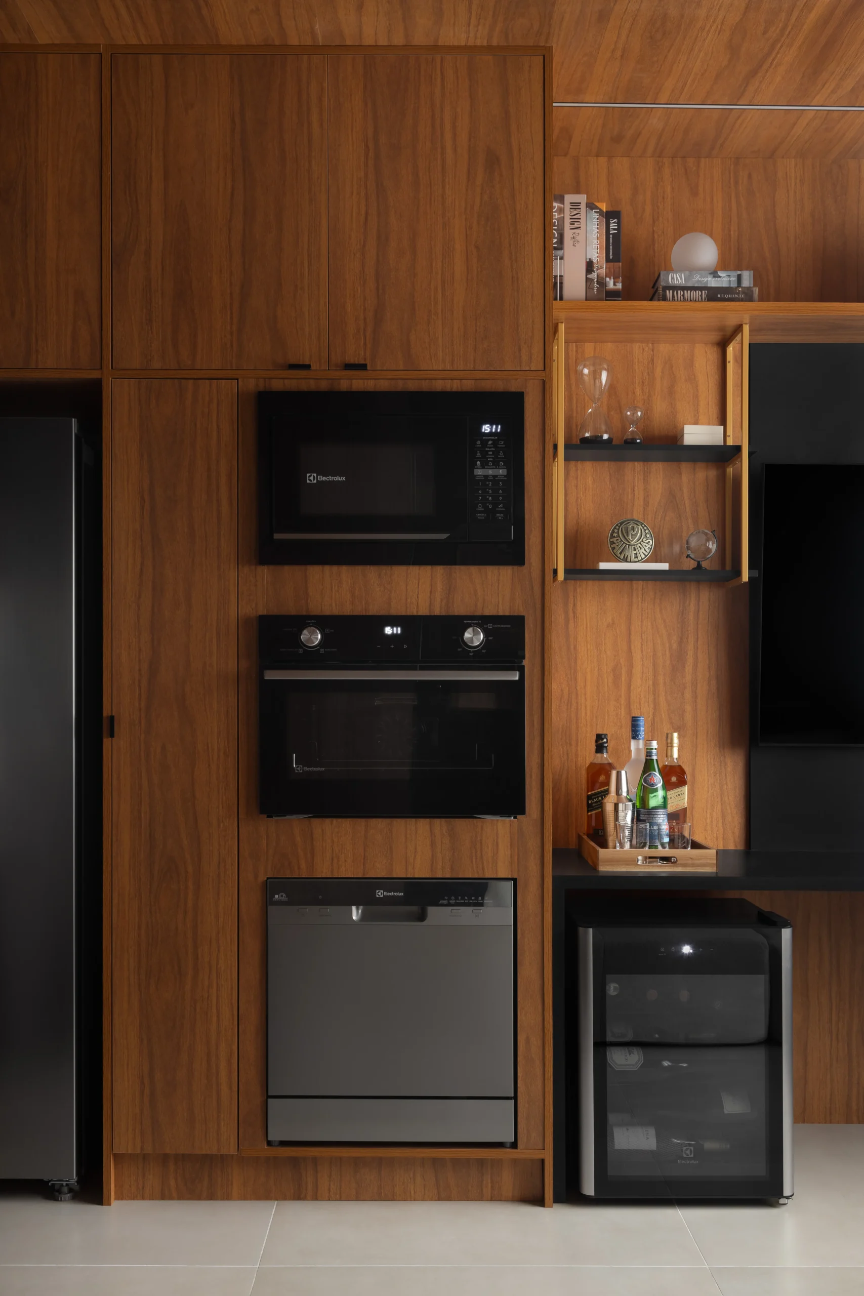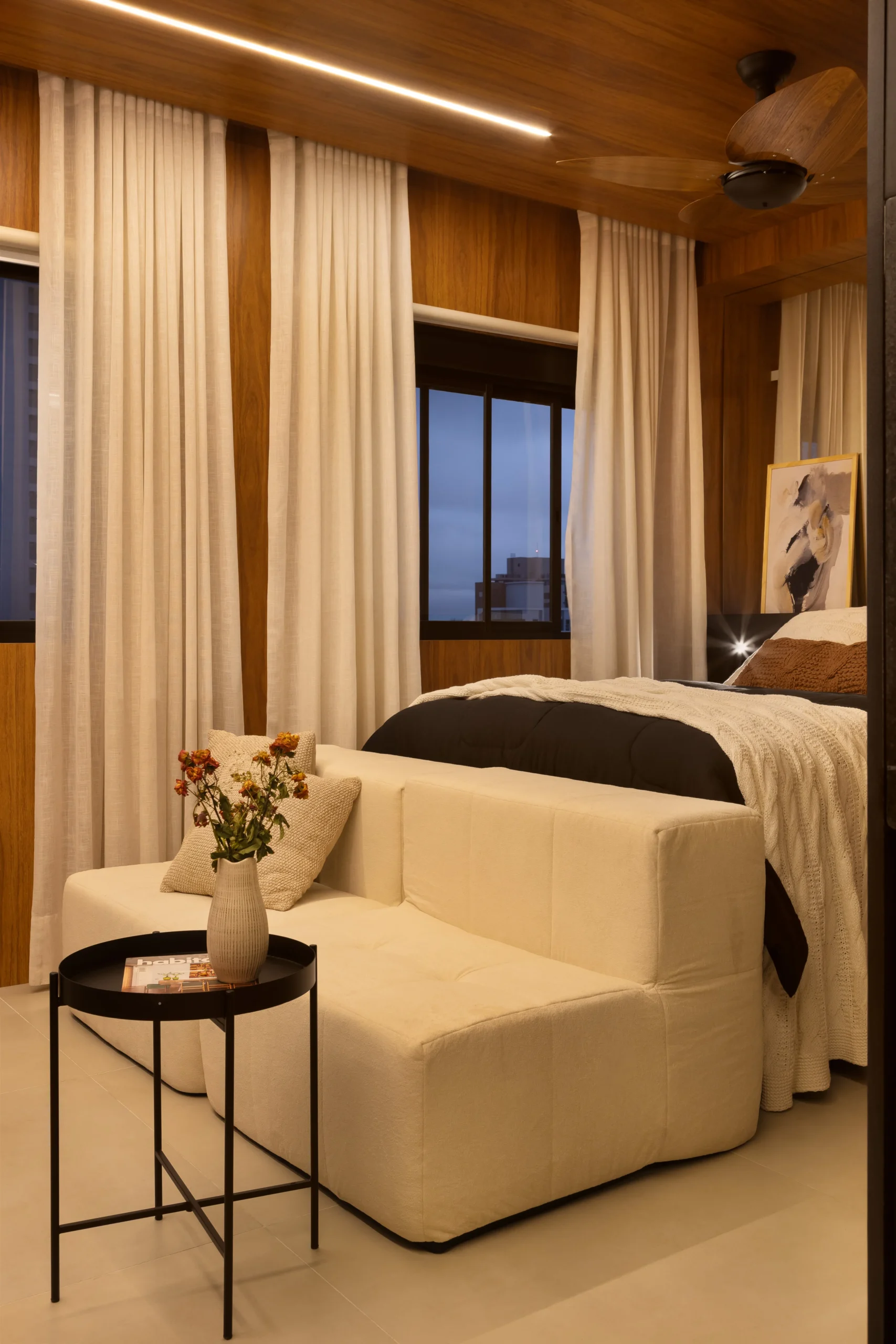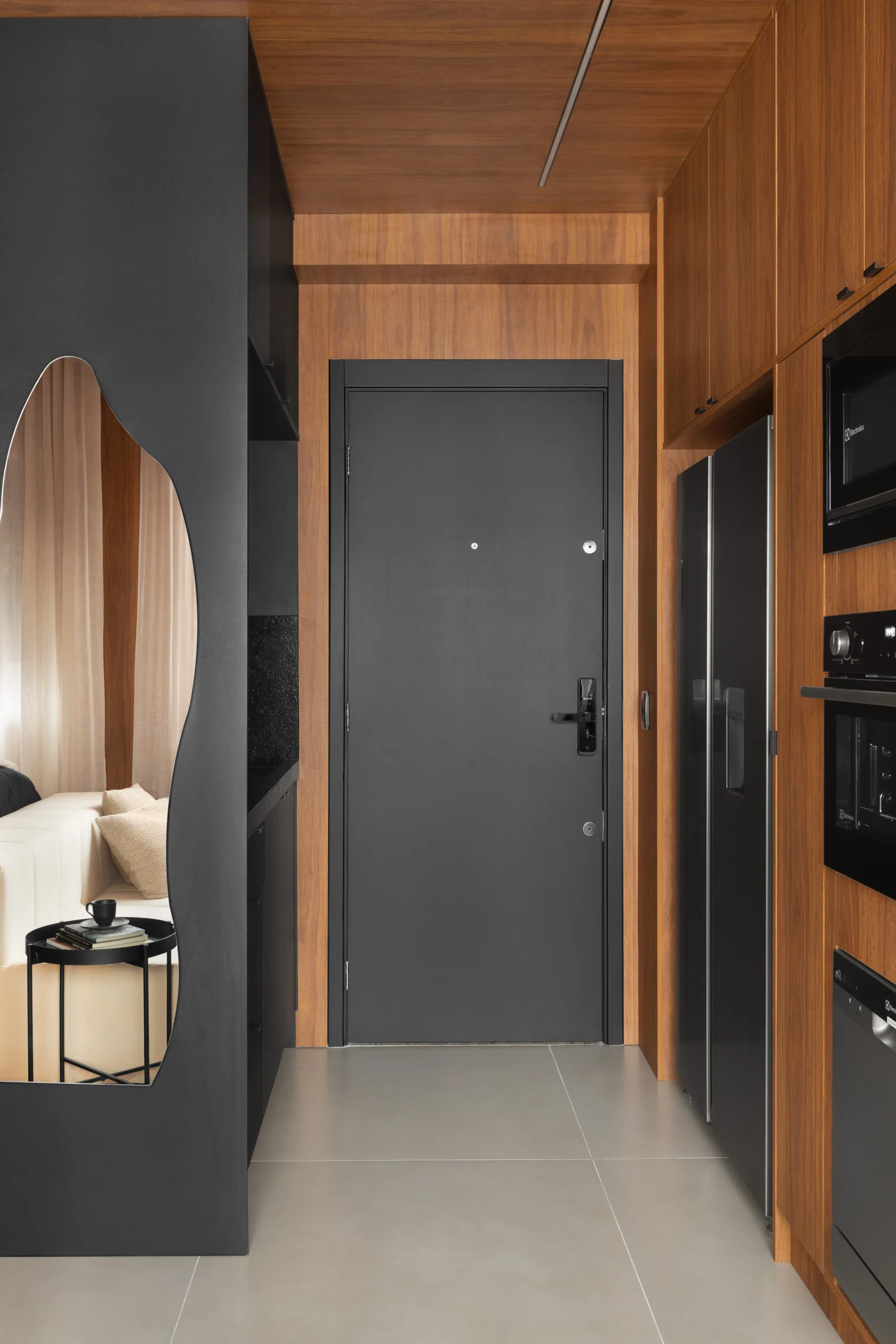Localizado em frente ao Allianz Parque, um dos principais polos de eventos e entretenimento de São Paulo, este projeto foi desenvolvido com foco em desempenho imobiliário, considerando o perfil de locação de curta e média duração da região. O apartamento de 26m², originalmente configurado com um dormitório, passou por uma reestruturação completa para adequação ao modelo de studio de alto padrão. A remoção da parede do quarto permitiu a criação de um ambiente integrado, com melhor aproveitamento espacial, maior continuidade visual e aumento da percepção de conforto; fatores diretamente relacionados à valorização do ativo. Todas as paredes do studio foram revestidas em marcenaria planejada, organizando e estruturando todo o espaço, garantindo unidade visual, eficiência funcional e facilidade de manutenção. O projeto contempla soluções completas de armazenamento, área de estar confortável, camas de alto padrão e televisão de 58”, compondo um layout equilibrado entre uso, estética sofisticada e durabilidade.