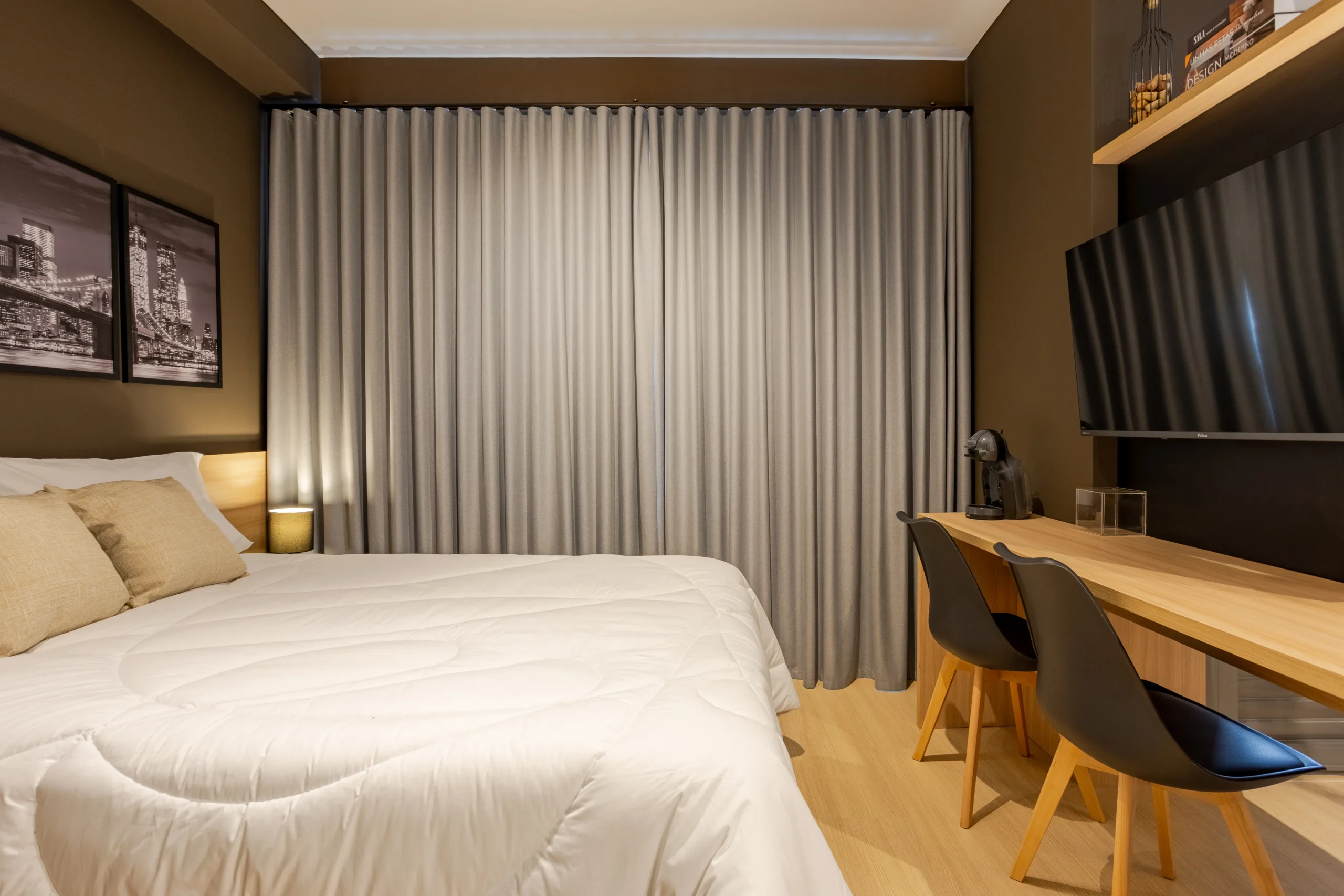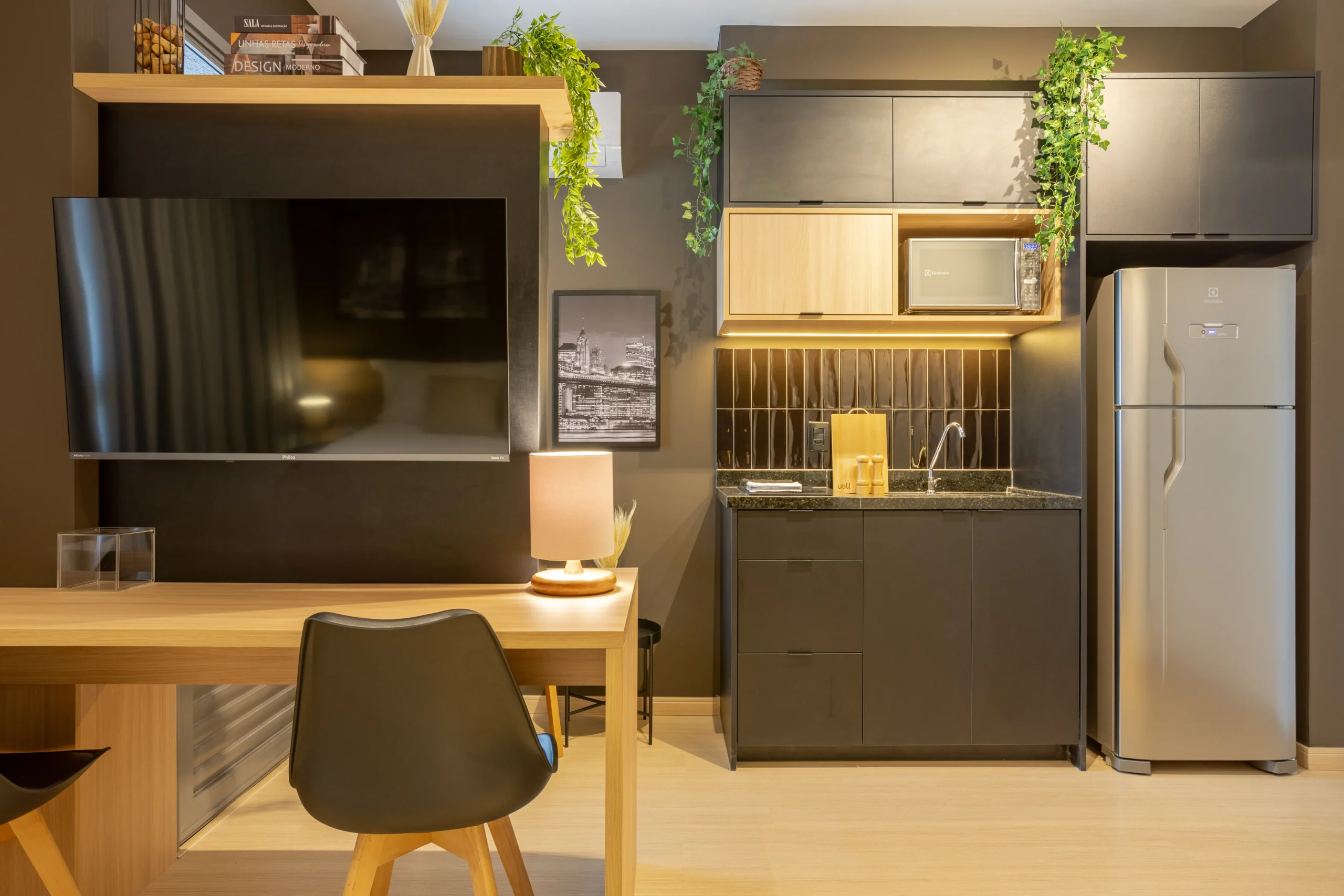 O projeto adota uma linguagem contemporânea, explorando tons escuros equilibrados por iluminação direta e indireta tanto no studio quanto no banheiro, assegurando conforto visual e valorização dos materiais.